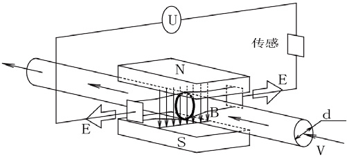 如圖,測(cè)量流量時(shí),流體流過(guò)垂直于流動(dòng)方向的磁場(chǎng),導(dǎo)電性流體的流動(dòng)感應(yīng)出一個(gè)與平均流速成正比的電勢(shì)。其感應(yīng)電壓信號(hào)通過(guò)兩個(gè)電極檢出,并通過(guò)電纜傳送至轉(zhuǎn)換器,經(jīng)過(guò)信號(hào)處理及相關(guān)運(yùn)算后,將累計(jì)流量和瞬時(shí)流量顯示在轉(zhuǎn)換器的顯示屏上。