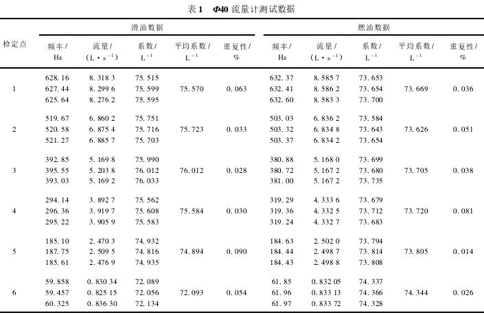 依據表1測試數據,經計算可得,Φ40流量計在滑油及燃油中測試結果如表2所示,測試線形圖如圖2所示。