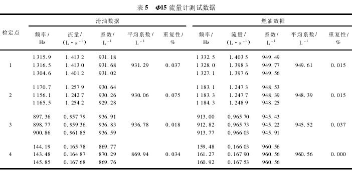 依據表5測試數據,經計算可得,Φ15流量計在滑油及燃油中測試結果如表6所示,測試線性圖如圖4所示。
