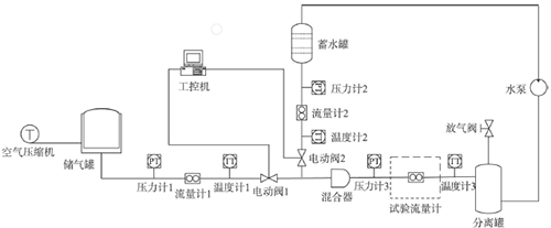 空氣壓縮機將空氣壓縮后送入儲氣罐,標準流量計1計量氣液混合前儲氣罐送入管道的氣體流量。蓄水罐距離地面30m,提供試驗所需的液相,其流量由標準流量計2測得。液相和氣相經(jīng)混和器混和后送入試驗管段,*后流入分離罐將水和空氣進行分離,空氣由放氣閥排出,水由水泵送回蓄水罐循環(huán)使用。工控機對所有儀表數(shù)據(jù)進行采集和顯示并對兩個電動調(diào)節(jié)閥進行控制,調(diào)節(jié)氣相和液相的流量。