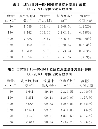 以使用廣泛的DN100B空氣流量計為例,系統(tǒng)運行時間為60s,標準裝置的滯止平均溫度為28.9℃,空間平均濕度為30%,流量計的平均溫度為28.3℃,在表體取壓孔取壓和管道取壓孔取壓的流量計檢定試驗數(shù)據(jù)分別如表1、2所示。
