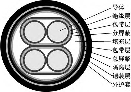 該新型電纜的結(jié)構(gòu)如圖1所示。導(dǎo)體為單股退火鍍錫軟銅線,以提高導(dǎo)體的導(dǎo)電性和防腐蝕性。在導(dǎo)體外繞包一層薄F4(聚四氟乙烯)半導(dǎo)電帶,有利于降低導(dǎo)體和絕緣之間的摩擦起電噪音。絕緣采用材料較為純凈、介電常數(shù)較小、具有一定彈性的聚丙烯絕緣級材料,并采用擠壓式擠出,減小絕緣層與導(dǎo)體的間隙。采用對絞組作為信號傳輸線,由于在兩根傳輸線上感應(yīng)的電壓接近相等,減小了電壓差值,提高了信號傳輸穩(wěn)定性;對絞組由兩種不同顏色絕緣線芯組成,相鄰線對對絞節(jié)距應(yīng)不大于100mm。對絞分屏蔽組(即對對絞組進(jìn)行分屏蔽,每對對絞組外繞包兩層聚酯帶和一層厚0.04mm鋁塑復(fù)合帶繞包,內(nèi)置一根7×0.26mm鍍錫銅絞線作引流線)有利于對不同對絞組之間信號串音的抑制和隔離。對絞分屏蔽組同心式絞合成纜,在對絞分屏蔽組間填充非吸濕性材料,以保證纜芯圓整。在成纜纜芯外繞包兩層聚酯帶,再采用鋁塑復(fù)合帶繞包,內(nèi)置鍍錫銅線作引流線,以提高電纜電磁屏蔽能力。總屏蔽層外擠包隔離層(隔離護(hù)套),隔離層采用絕緣級低密度聚乙烯材料。隔離層外采用鎧裝層,鎧裝材料為高導(dǎo)磁合金鋼帶,其為強(qiáng)磁材料,可將外來的磁通大部分限制在鎧裝層的外表面上(僅有少部分能進(jìn)入被屏蔽的空間);鎧裝時對高導(dǎo)磁合金鋼帶采用縱包焊接,確保其形成一連續(xù)圓柱管;鎧裝層可提高電纜抗電磁干擾水平以及對電纜進(jìn)行加強(qiáng),減少電纜振動引起的電動勢。外護(hù)套采用藍(lán)色軟PVC(聚氯乙烯)護(hù)層級電纜材料擠包,實現(xiàn)電纜防護(hù)。