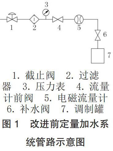 其工作過程為:當設(shè)定好加水量后,啟動系統(tǒng)往調(diào)制罐 7 內(nèi)定量加水,流量計前閥 4 開啟對管路進行預填充,延時一定時間后,調(diào)制罐補水球閥 6 開啟,同時管道電磁流量計開始計量,當管道電磁流量計的累積量與設(shè)定加水量一致時,球閥 4 和 6 關(guān)閉,定量加水過程完成。在設(shè)備使用的過程中,發(fā)現(xiàn)定量加水系統(tǒng)存在以下問題: