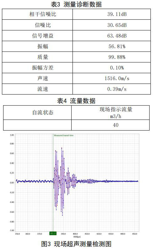 在高負(fù)荷段采用泵送補(bǔ)給水狀態(tài):測(cè)試時(shí)間 2018年10月11日,采用德國(guó)FLUEX高精度外夾式超 聲波流量計(jì)作為標(biāo)準(zhǔn)流量計(jì),測(cè)量基礎(chǔ)數(shù)據(jù):管道 外徑276.93mm,管壁厚度12.40mm,采用兩聲程169mm傳感器安裝距離,通過(guò)對(duì)超聲波流量計(jì)信號(hào) 分析與診斷(數(shù)據(jù)見(jiàn)表1、表2和圖2),診斷數(shù)據(jù) 提示標(biāo)準(zhǔn)超聲波流量計(jì)測(cè)量狀況佳,檢測(cè)開(kāi)始,啟 動(dòng)補(bǔ)給水泵,運(yùn)行一段時(shí)間流量穩(wěn)定后,測(cè)量結(jié)果 如下: