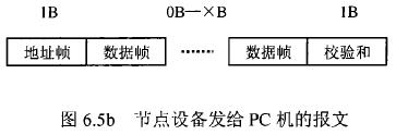 在花生油流量計等節點設備和C機通信的過程中,由地址幀、命令幀、數據幀、校驗和可組成各種功能不同的報文。由于采用主從工作方式來實現通信,花生油流量計等節點設備僅能接收并執行PC機發送來的控制命令,而不能發送命令給PC機。因此,由PC機發往流量計等節點設備的報文一般包括一個地址幀,一個命令幀,若干個數據幀和一個校驗和,其報文格式圖.6a5所示;而由流量計等節點設備發往PC機的報文一般包括一個地址幀,若干個數據幀和一個校驗和,其報文格式如圖6.5b所示。