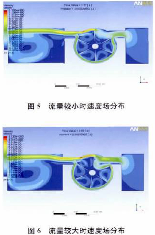 圖9記錄的是切向渦輪正常轉動時的流場,圖9中水從左向右流動,實驗時水速較快(1m3/d),渦輪葉片順時針轉動。水速變大后,擾動變大,不再是無旋繞角流動,腔體1中流體形成一個運動的旋渦,導致腔內壓強分布不再對稱,產生壓差,致使渦輪葉片轉動,旋渦在隨葉片運動到腔體2中時逐漸耗散消失。數值仿真的計算結果與物理實驗的結果基本一致。