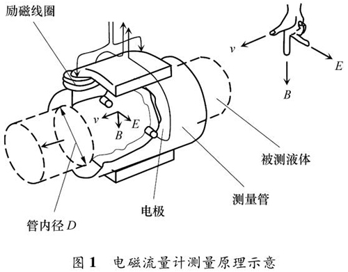 乙醇管道流量計的測量原理如圖 1 所示。根據(jù)法拉*電磁感應定律,導電液體在磁場中流動會產(chǎn)生電動勢 E,它與磁感應強度 B、導電液體平均流速 v 成一定比例關(guān)系: