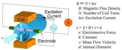 基本上,當導電液體流過磁場時,會感應出電壓。為了測量該產生的電壓(與流動的液體的速度成正比),使用了兩個彼此相對安裝的不銹鋼電極。