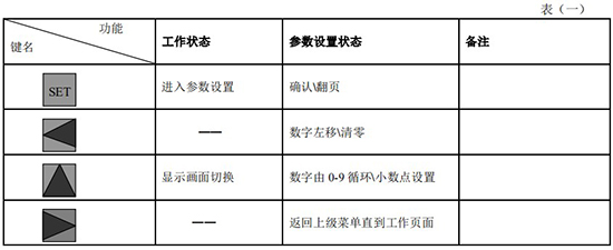 (3)標況流量計算公式(若補償后單位為 U.0):(4)標況流量計算公式(若補償后單位為 U.1):注:標況指 20℃,1 標準大氣壓三、一體化液晶顯示表頭參數(shù)設置操作說明(V03Z)1、鍵盤按鍵說明2、 顯示窗字符說明注:表中 x 代表“0”或“1”;Zn:標準狀態(tài)下(20℃,1 標準大氣壓),被測氣體的壓縮系數(shù),Z:工作狀態(tài)下被測氣體的壓縮系數(shù)3、 操作說明3.1、本儀表表頭采用自導引式和菜單式相結合的參數(shù)設置方式,所謂自導引式參數(shù)設置方式就是用戶在進入菜單 00 項后,表頭中的微電腦會自動導引用戶去設置需要設置的參數(shù)。另外,用戶也可以通過菜單模式分別對各組參數(shù)進行設置。蒸汽測量菜單框圖如下:3.2、參數(shù)設置約定:在設置各項參數(shù)時,提示符閃動代表該項參數(shù)沒有設置完或者尚未確認,可以通過按SET 鍵來確認或者按→鍵退出;提示符不閃動代表該項參數(shù)已設置完并確認,此時可以通過按 SET 鍵翻頁或者按→鍵退出。進入?yún)?shù)設置時,需要輸入密碼(6 位)并確認進入,為了防止誤進入?yún)?shù)設置菜單,保證儀表正常工作,在設置密碼時,使用↑鍵調(diào)數(shù)時不能循環(huán)調(diào)數(shù),只能單次調(diào)數(shù),只有密碼輸入正確進入各項參數(shù)設置菜單后才可以對各位循環(huán)連續(xù)調(diào)整數(shù)據(jù)。3.3、儀表參數(shù)設置舉例:儀表出廠前各項參數(shù)已設置好,用戶無需設置。如果用戶需要設置某項參數(shù),請參照以下步驟,例如修改刻度流量值 QT:在工作狀態(tài)下,按 SET 鍵,顯示屏顯示 P,數(shù)字位為全零,8 秒鐘若無操作,自動返回工作狀態(tài)。輸入密碼 :按數(shù)字↑鍵和左移←鍵,輸入密碼數(shù) xxxxx(出廠時默認密碼為 000123),↑鍵調(diào)各位數(shù)字 0-9,每按 ←鍵一次數(shù)字向右循環(huán)一位,可通過多次按←鍵對整段數(shù)字清零,按→鍵可以返回工作狀態(tài)。菜單選擇項:按 SET 鍵確認,顯示屏顯示如右圖所示,末行“00”閃動調(diào)整該項值選擇不同參數(shù)設置菜單。該例直接按 SET 鍵進入菜單 00 項設置刻度流量:QT 閃動,*一步:*先進行小數(shù)點調(diào)整,可以通過←鍵對參數(shù)快速清零或者通過↑鍵進行小數(shù)點調(diào)整,調(diào)整完畢,按 SET 鍵確認(QT 仍閃動);*二步:數(shù)值調(diào)整,可以通過↑鍵對每位數(shù)字進行調(diào)整,按 ←鍵一次數(shù)字向右移動一位,調(diào)整完畢,按 SET 鍵確認,QT 停止閃動,該項參數(shù)設置完畢,可進行下一項參數(shù)設置或者退出另外,單位設置 U.X 和補償方式設置 dX 通過↑鍵調(diào)整修改。3.4、校驗項說明: 儀表出廠前,溫度和壓力通道已校驗設置好,無需用戶重新校驗。校驗通道有密碼保護,廠家不對外開放,如果需要重新校驗溫度或者壓力通道,請專業(yè)人員與廠家技術人員聯(lián)系。4、計算公式說明4.1、蒸汽測量計算公式(1)渦街流量儀表工況體積流量計算公式:(2)密度 d,單位 Kg/m3(3)質(zhì)量流量計算公式,單位 Kg/h:(4)質(zhì)量流量計算公式,單位 t/h:4.2、氣體測量計算公式----標況指 20℃,1 標準大氣壓(1)渦街流量儀表工況體積流量計算公式:(2)對比壓縮系數(shù) d(Zn/Z),單位 1(3)標況流量計算公式,單位 Nm3/h:P1—工況絕壓,PN—標況絕壓(Mpa),T1—工況熱力學溫度,TN—標況熱力學溫度(K)